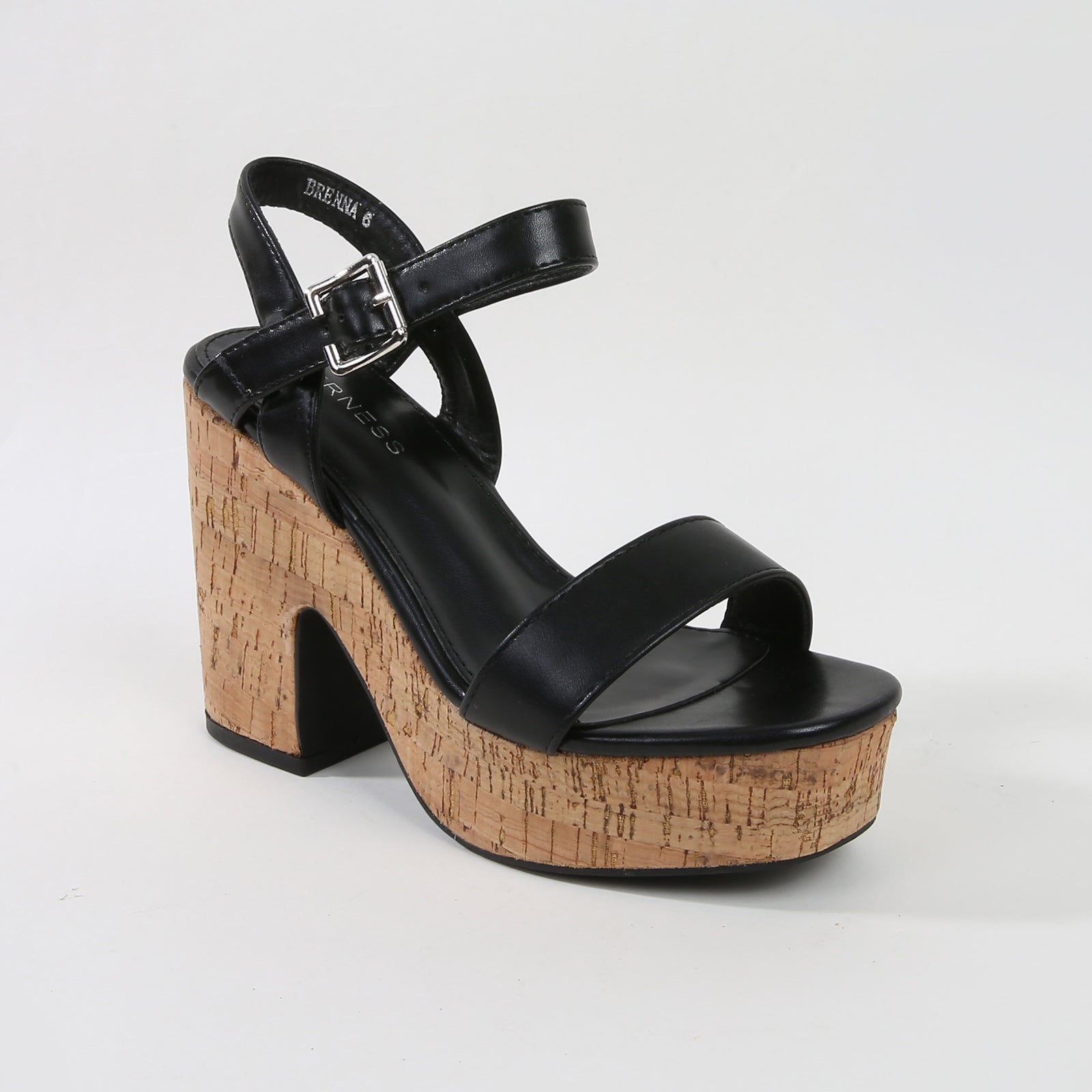 Designed with a sturdy cork block heel and platform, these sandals offer both height and comfort, making them perfect for warm-weather outings. The sleek leather straps provide a versatile, minimalist look that pairs effortlessly with any outfit, while the adjustable buckle ensures a secure and comfortable fit. Ideal for adding a playful yet stylish lift to your ensemble, these sandals are a must-have for both casual days and fun nights out.