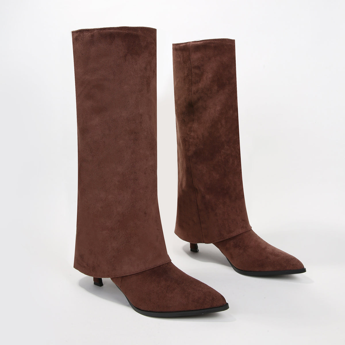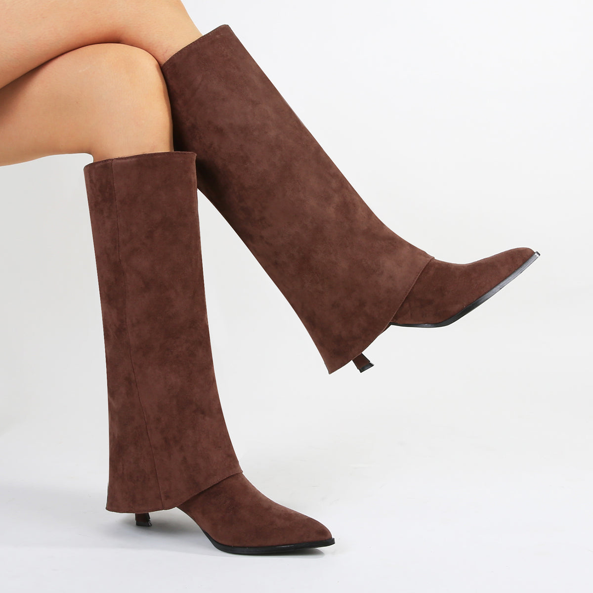Bold and trend-forward knee high boots with a dramatic fold-over shaft. Crafted in luxe suede, they bring a statement silhouette that elevates everything from sleek dresses to casual denim looks.