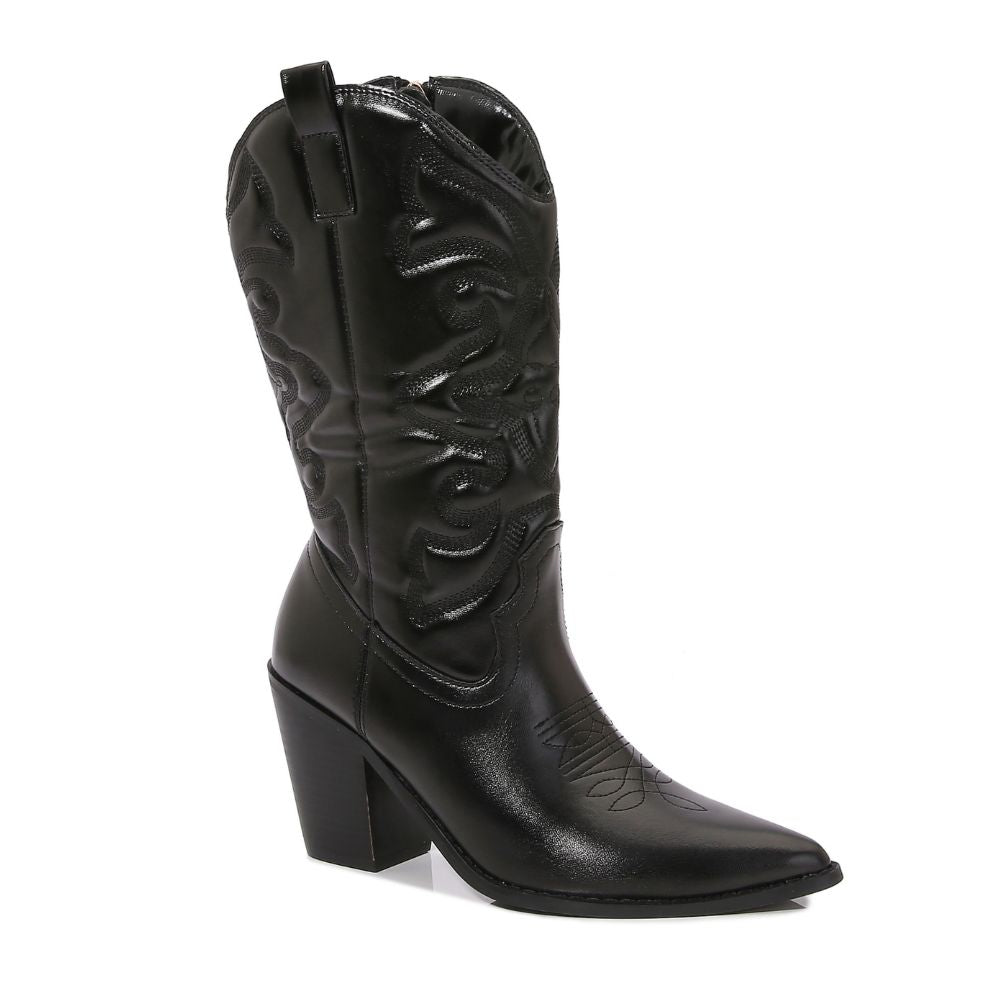 Combining classic cowboy boot elements with a modern edge, these boots feature intricate tonal embroidery and a sharp pointed toe for a refined, fashion-forward look. Whether you're dressing up or going for a casual-chic vibe, these black cowboy boots are a versatile statement piece that adds bold style to any outfit.