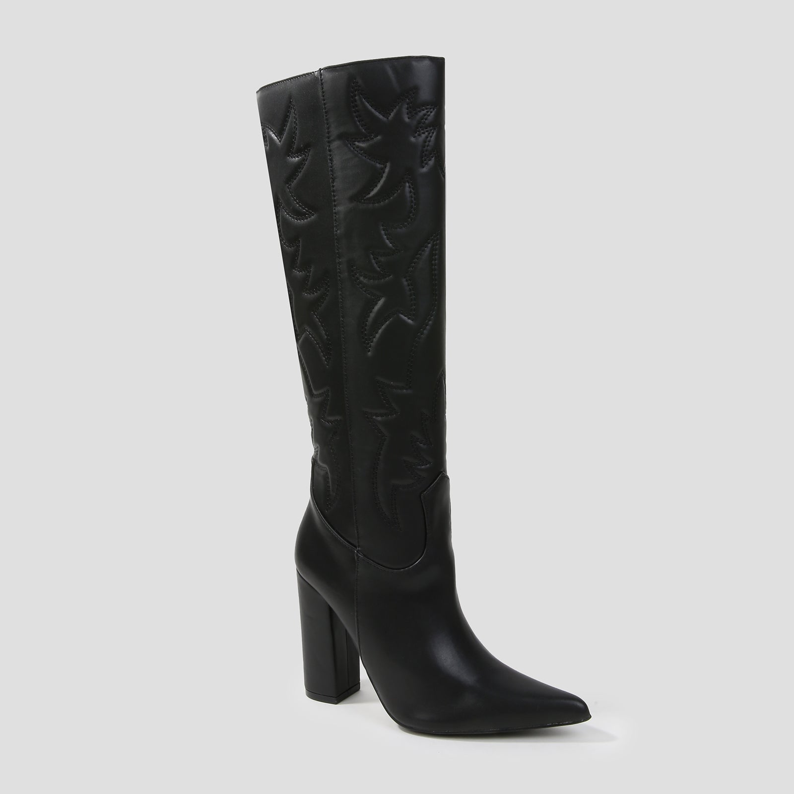 A bold, refined take on the classic western silhouette. These knee-high boots feature sculpted stitching and a sleek block heel, making them the perfect statement piece for nights out, fall outfits, or dressed-up everyday looks.