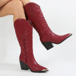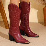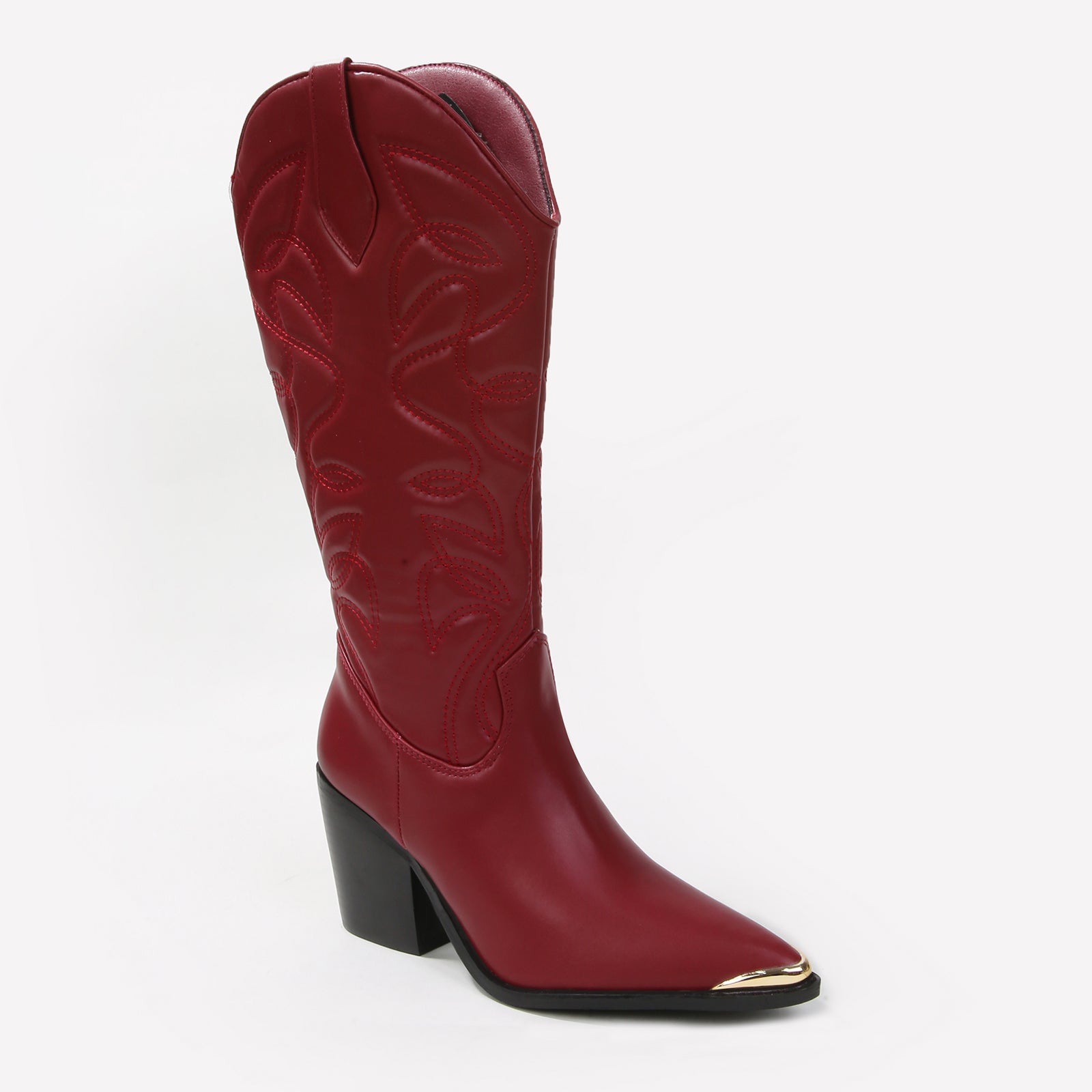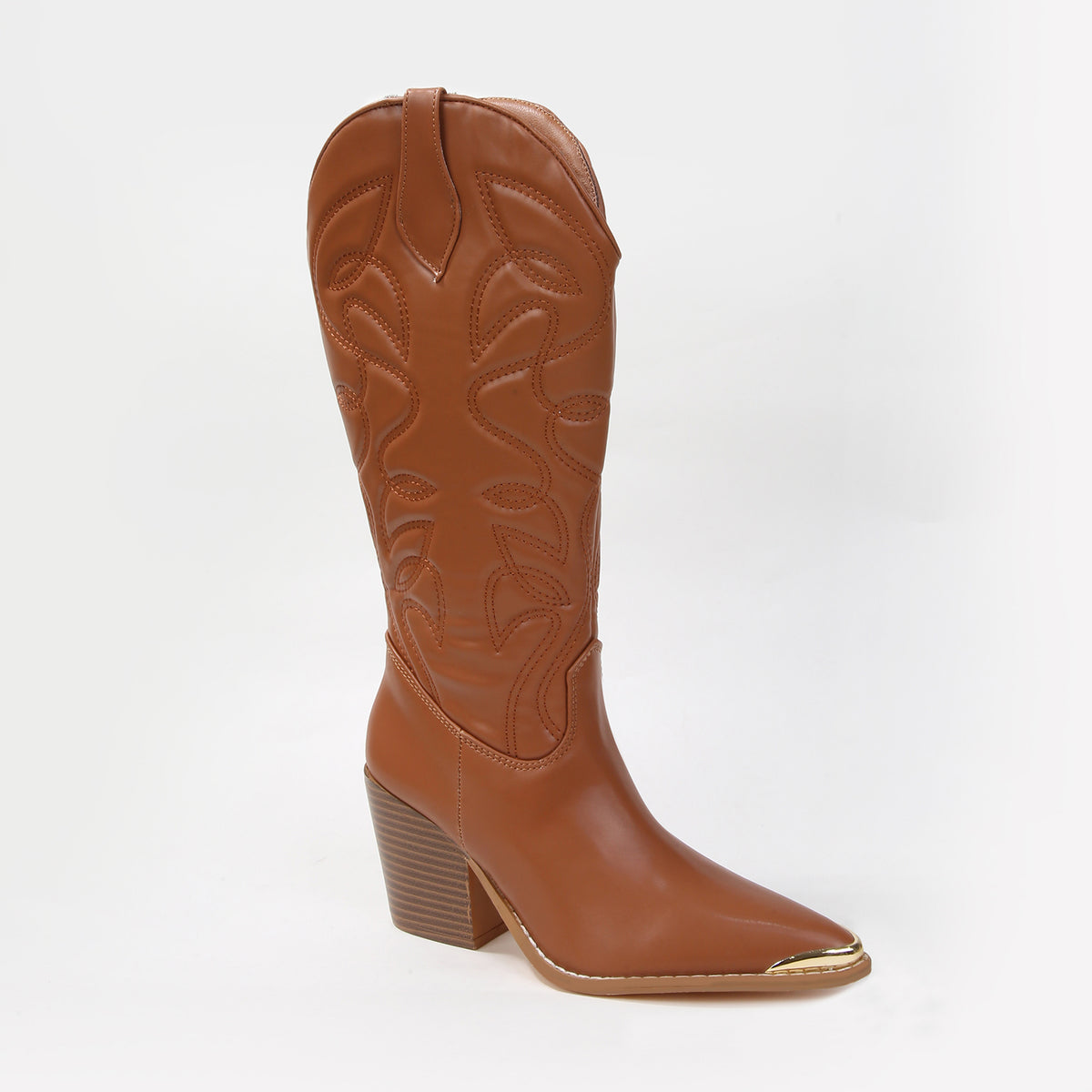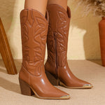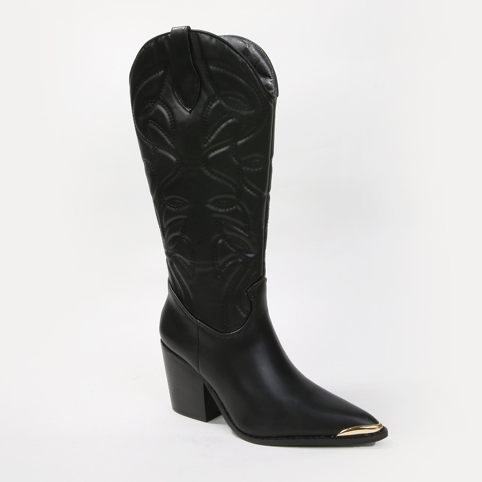 A bold Western-inspired silhouette meets a sleek pointed toe and metal toe cap, creating a modern twist on the classic cowboy boot. Finished with decorative stitching and a sturdy block heel, these boots add instant attitude. Perfect for fall outfits, festivals, weekends, or statement everyday looks.
