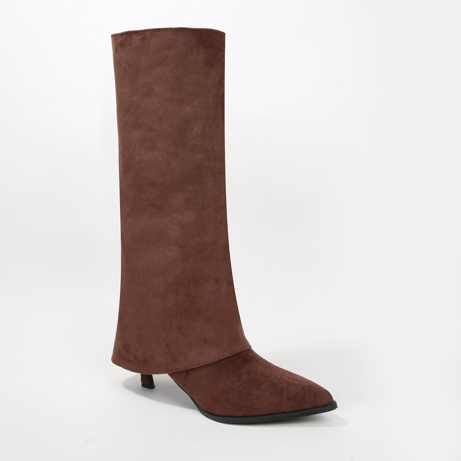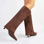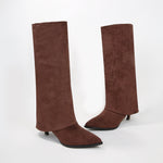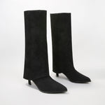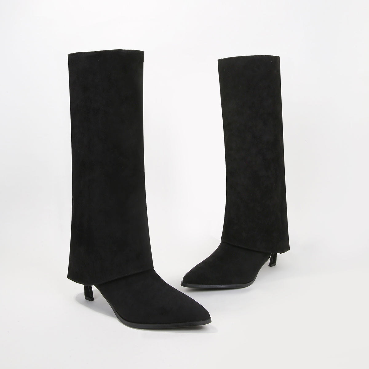 Bold and trend-forward knee high boots with a dramatic fold-over shaft. Crafted in luxe suede, they bring a statement silhouette that elevates everything from sleek dresses to casual denim looks.
