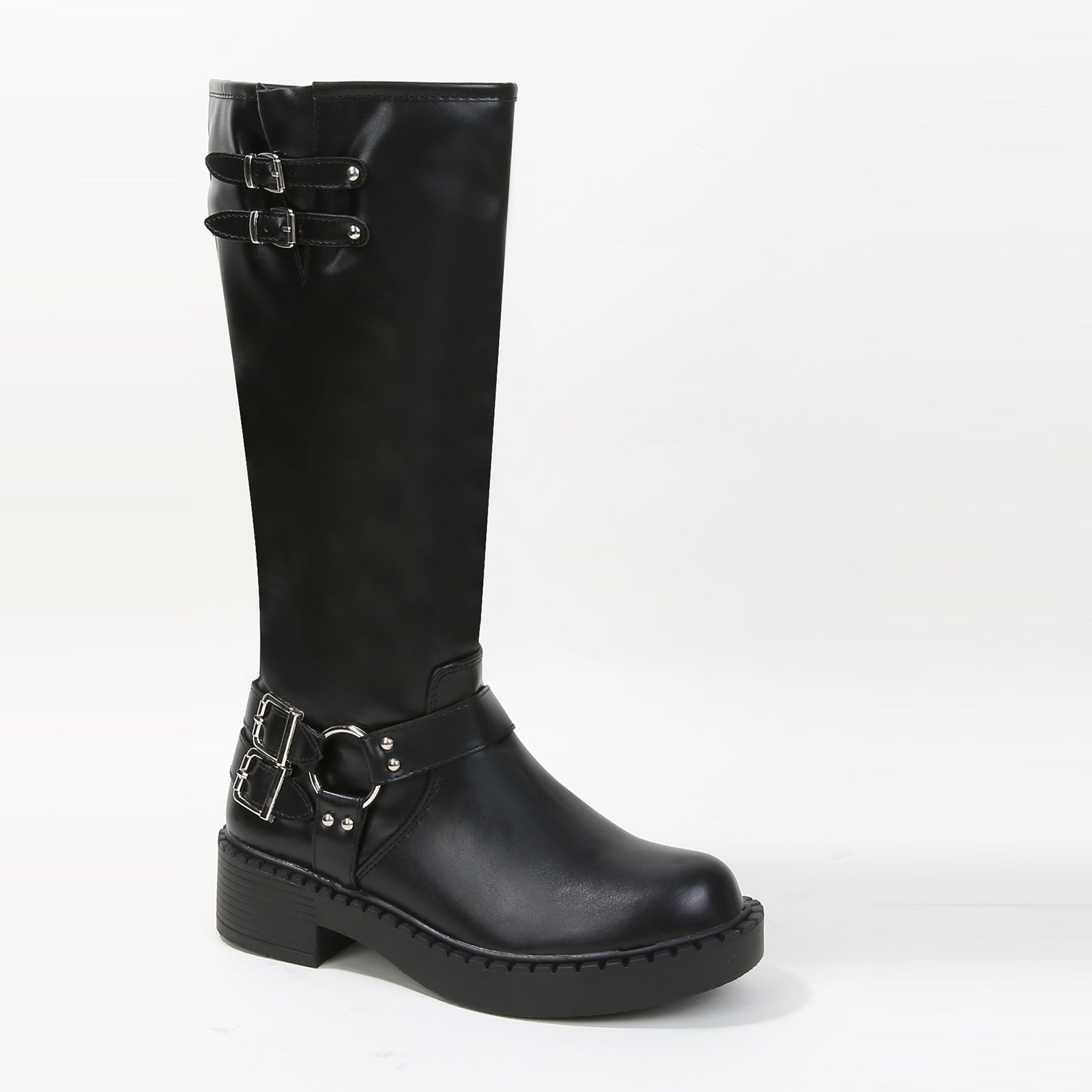 Arya Buckled Faux Leather Knee High Biker Boots