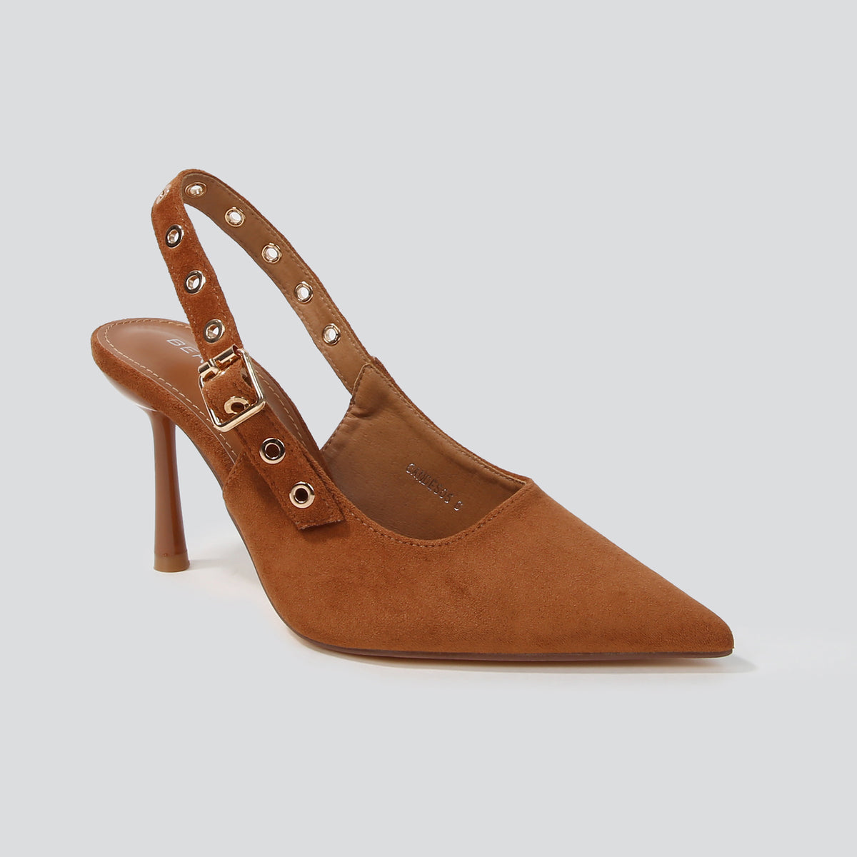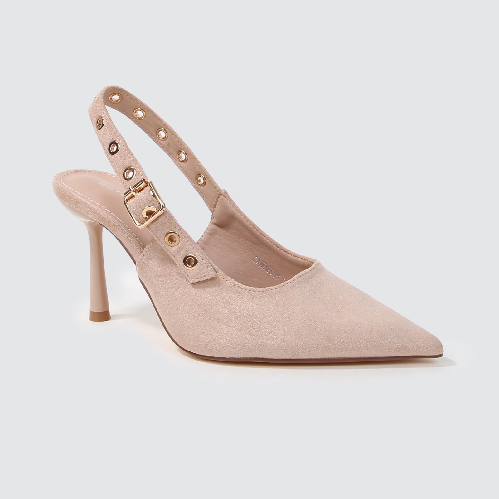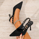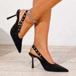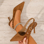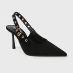 Refined and effortlessly feminine, these pointed-toe slingback heels are crafted in soft faux suede and accented with eyelet-detailed straps for a subtle statement. Designed with a sleek stiletto heel and an adjustable slingback fit, they transition seamlessly from polished daytime looks to elevated evening ensembles.