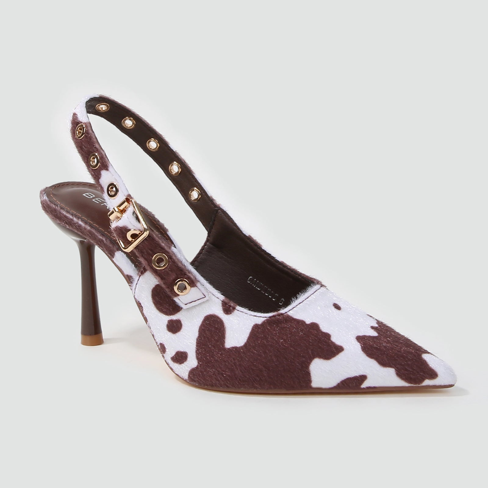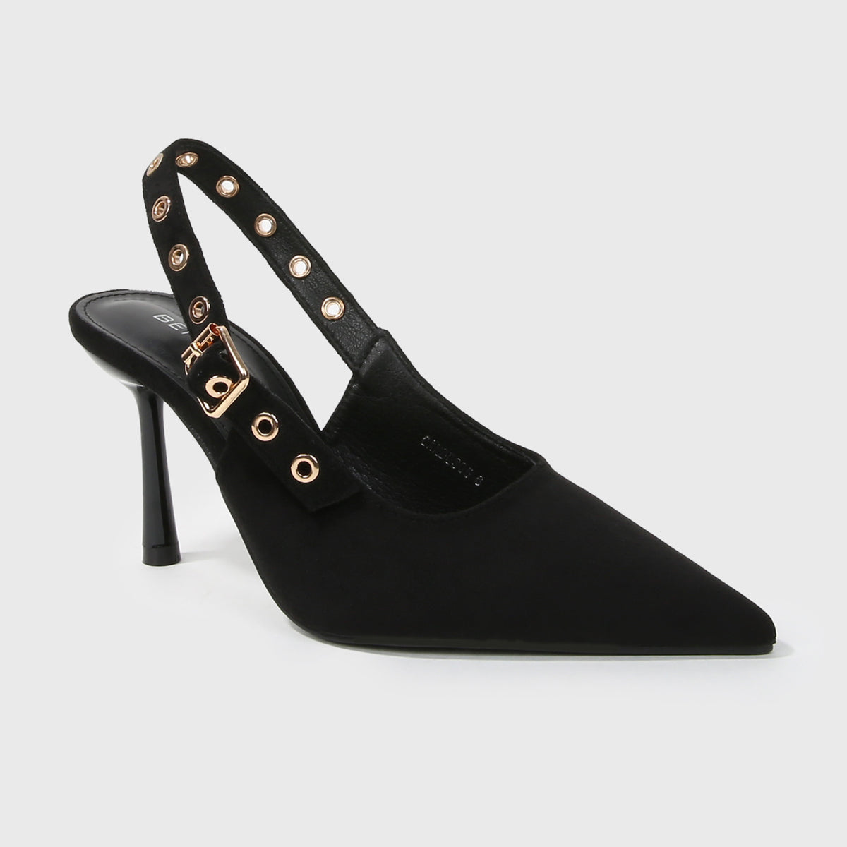 - Adjustable slingback strap with metal eyelet detailing for a modern edge
