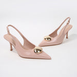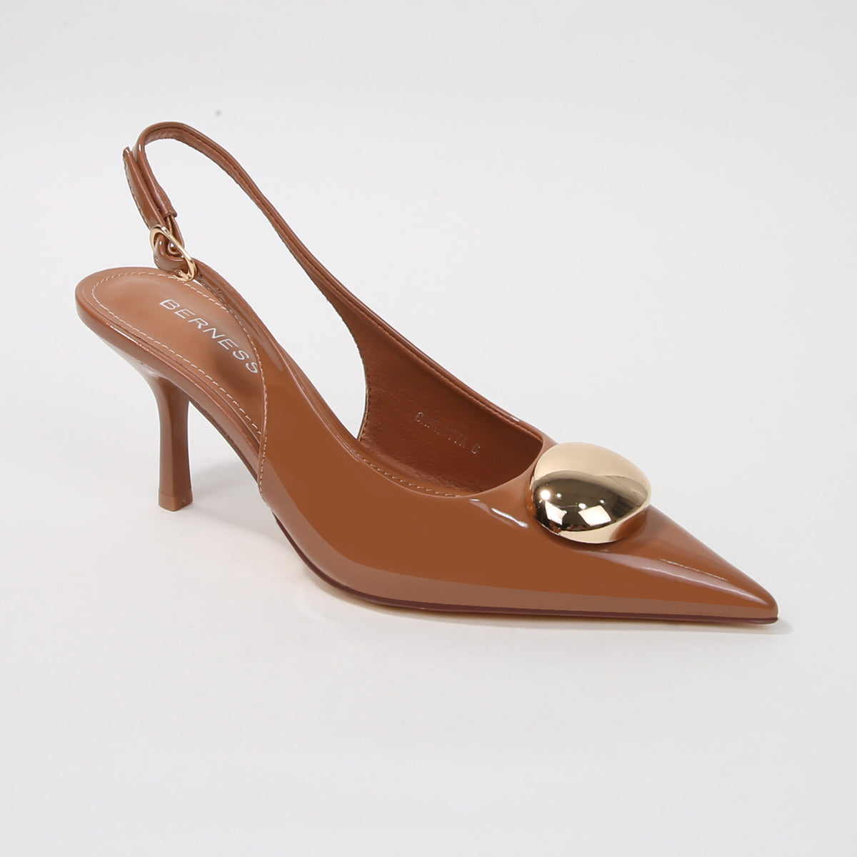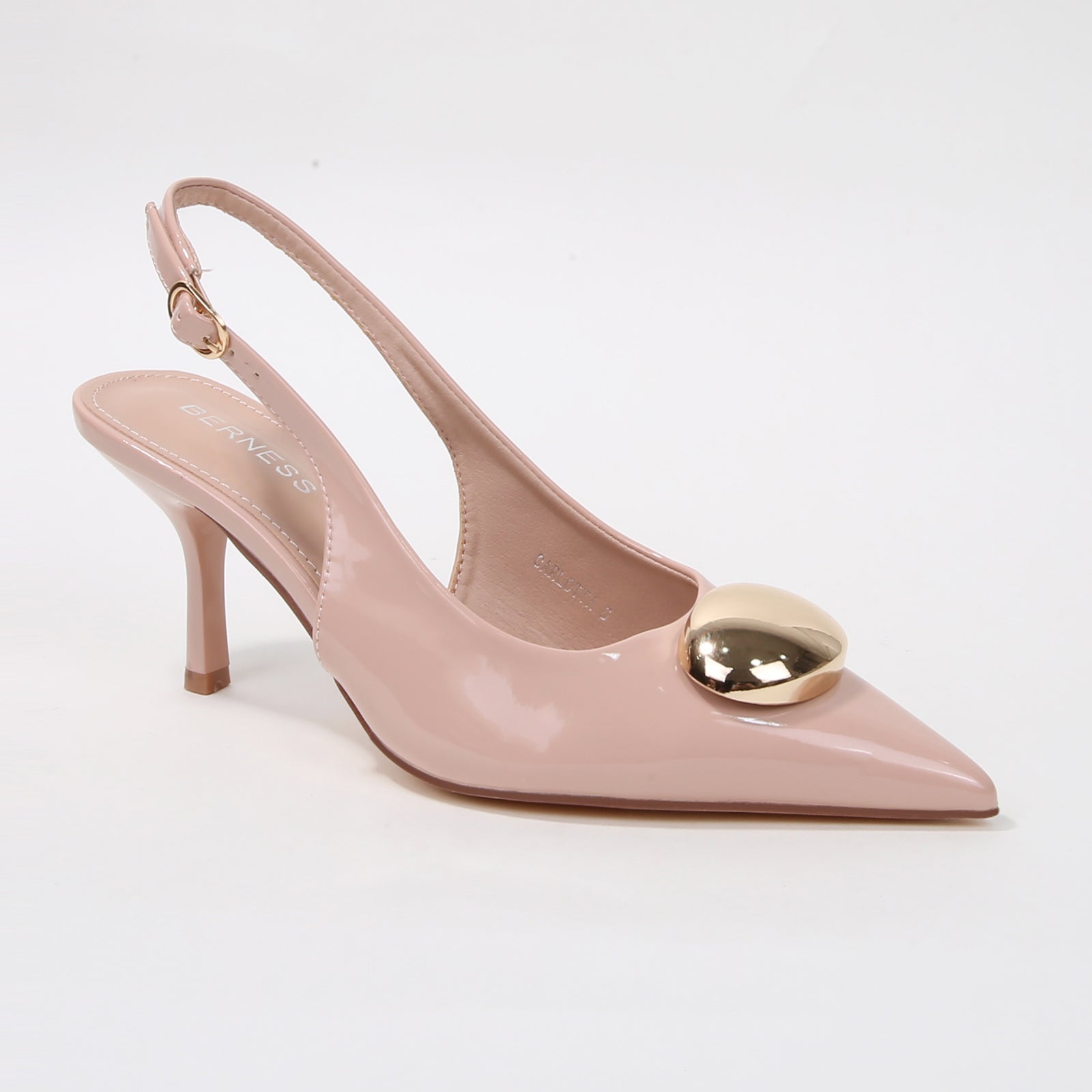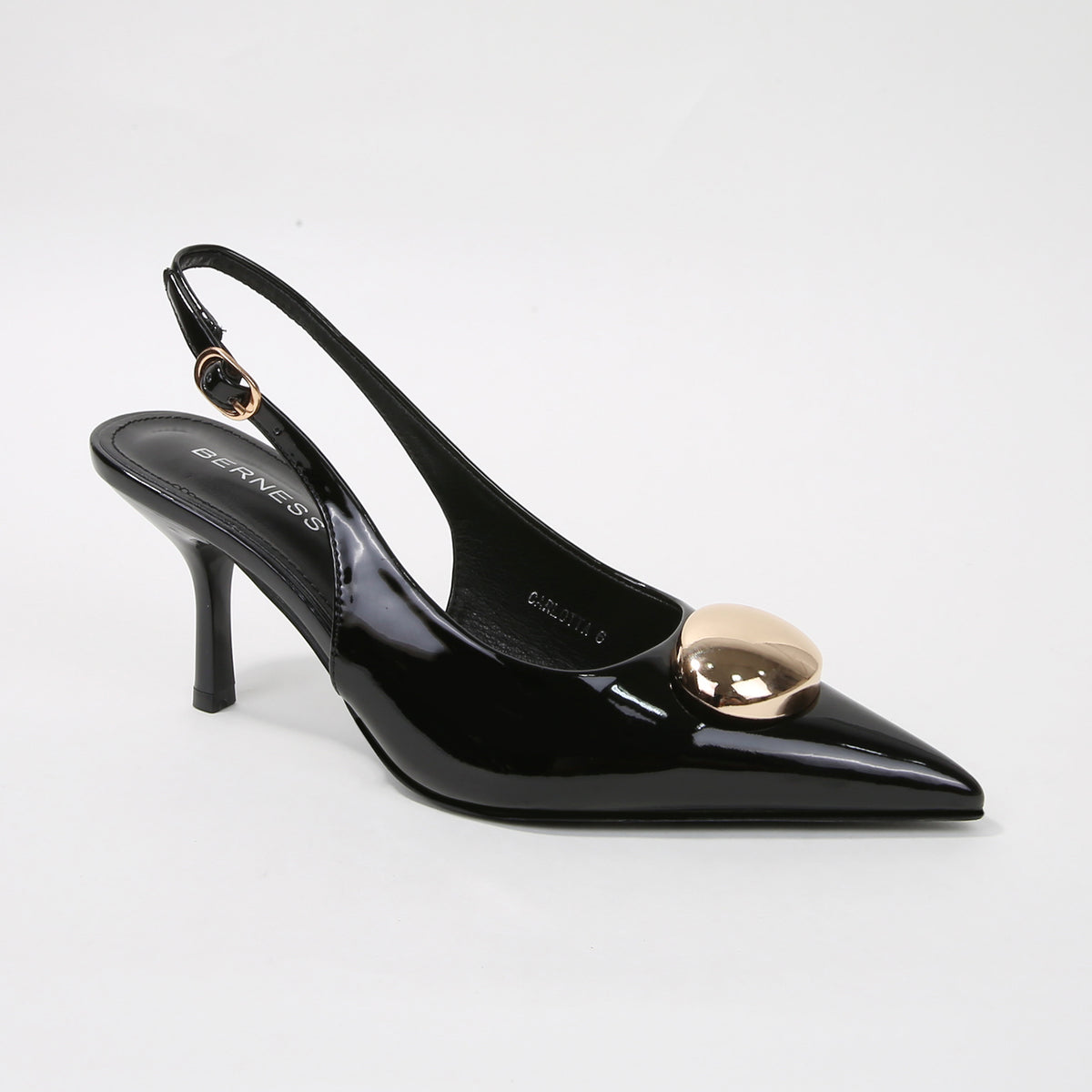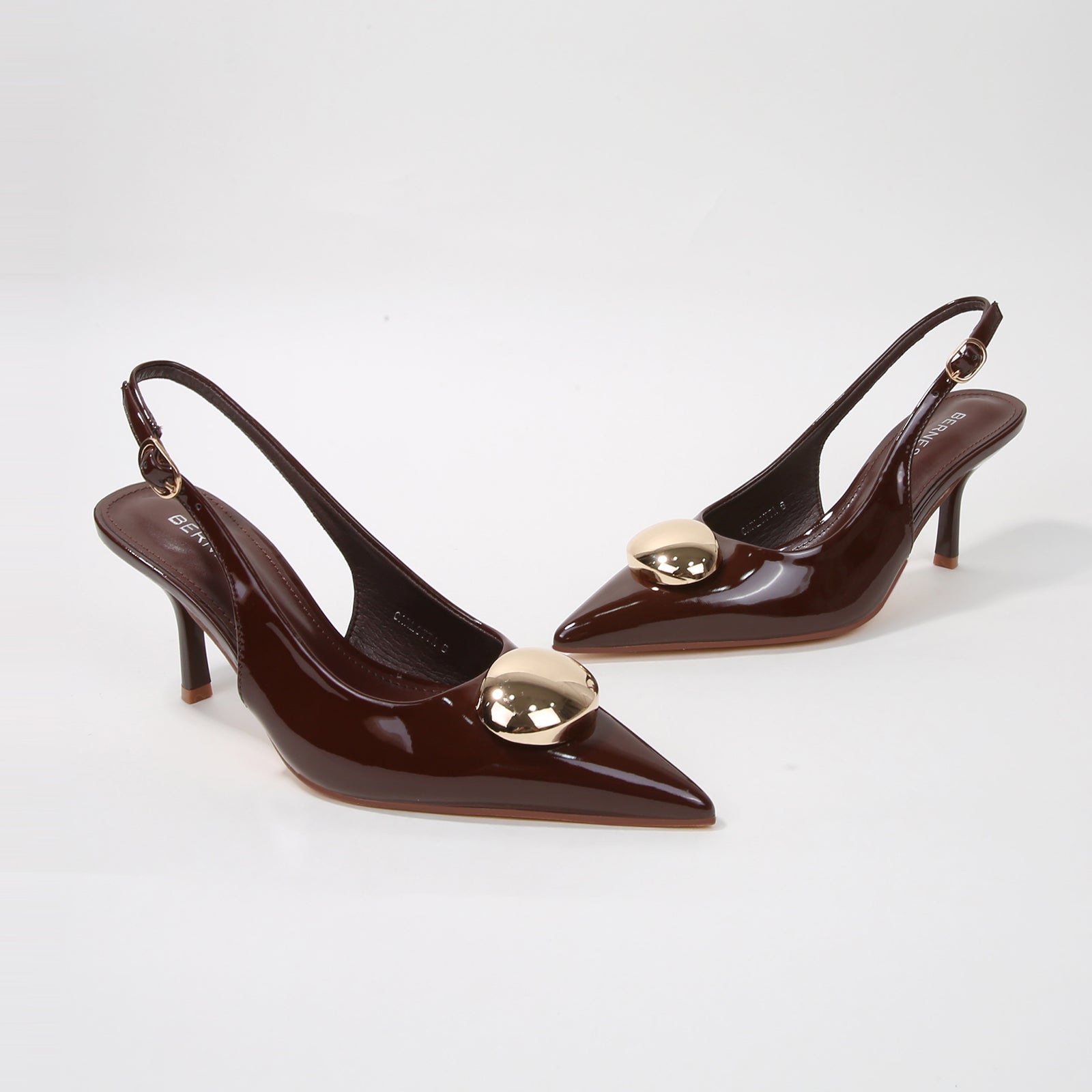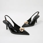 A glossy patent finish and a striking gold dome detail bring modern elegance to this pointed-toe slingback heel. Perfect for evenings out, special events, or anytime you want a bold yet refined statement.
