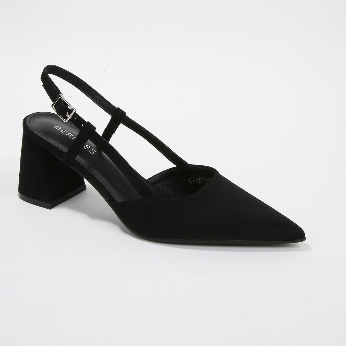 Elegant suede slingback pumps with a sharp pointed toe and supportive block heel. Finished with slim strap accents and an adjustable buckle, they bring refined sophistication to both professional and evening looks.