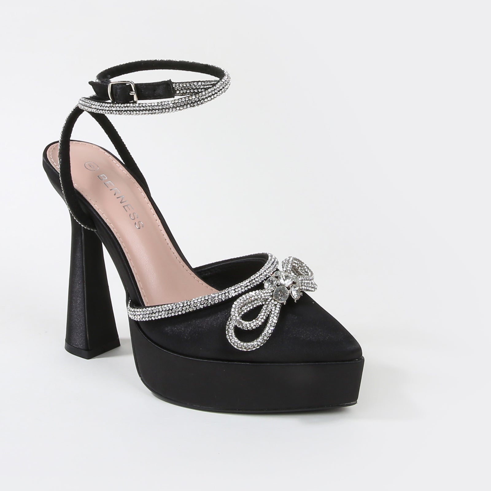 Stand out in style with these glamorous platform heels, designed for the bold and fashion-forward. Featuring a striking glitter bow detail and a dazzling ankle strap, these heels bring a playful yet sophisticated touch to any outfit. The towering block heel and platform provide extra height while ensuring stability and comfort, making them perfect for parties, nights out, or special occasions.