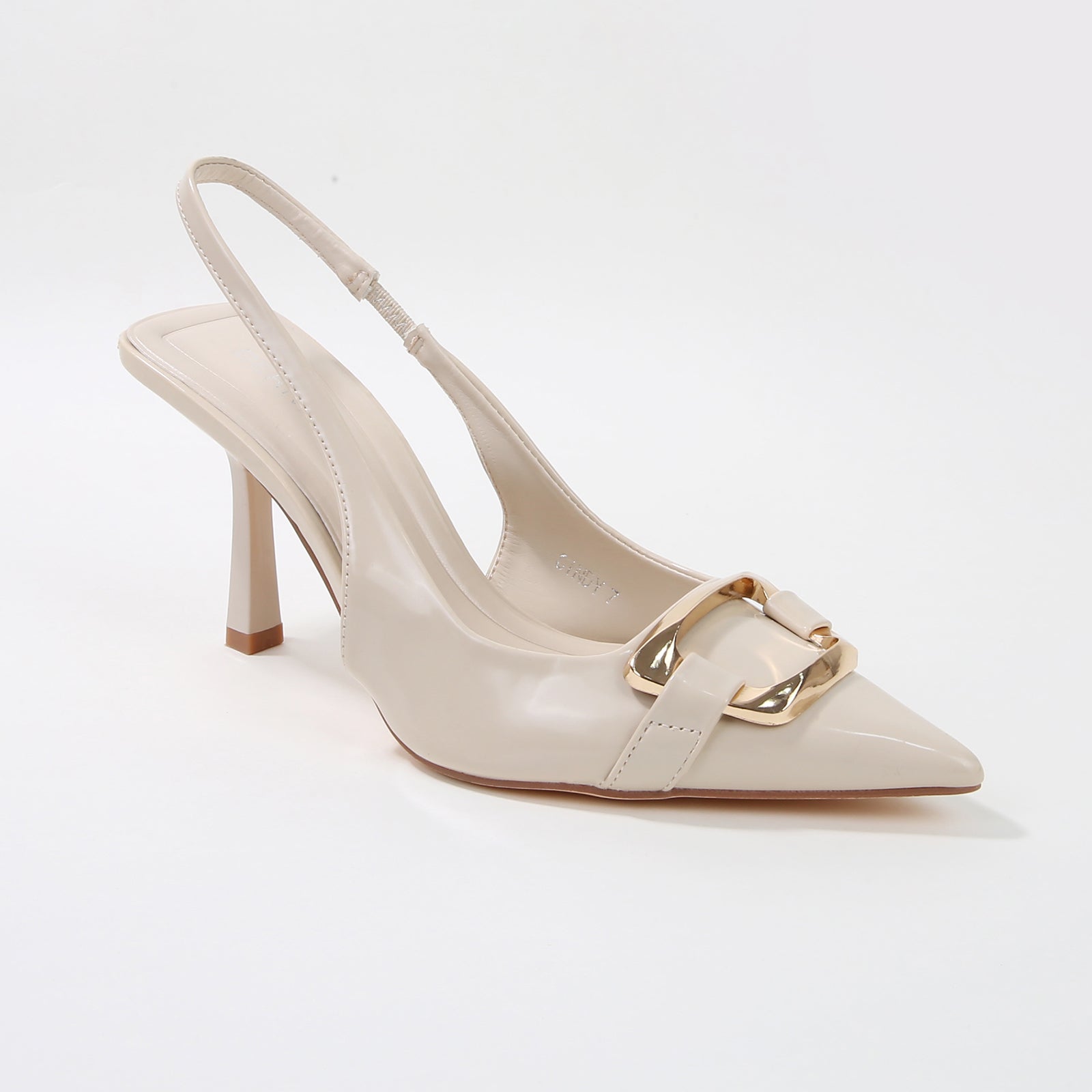 Bold and refined. These pointed-toe slingback heels showcase a statement buckle and glossy finish, adding a polished touch to party outfits and sleek evening styles.