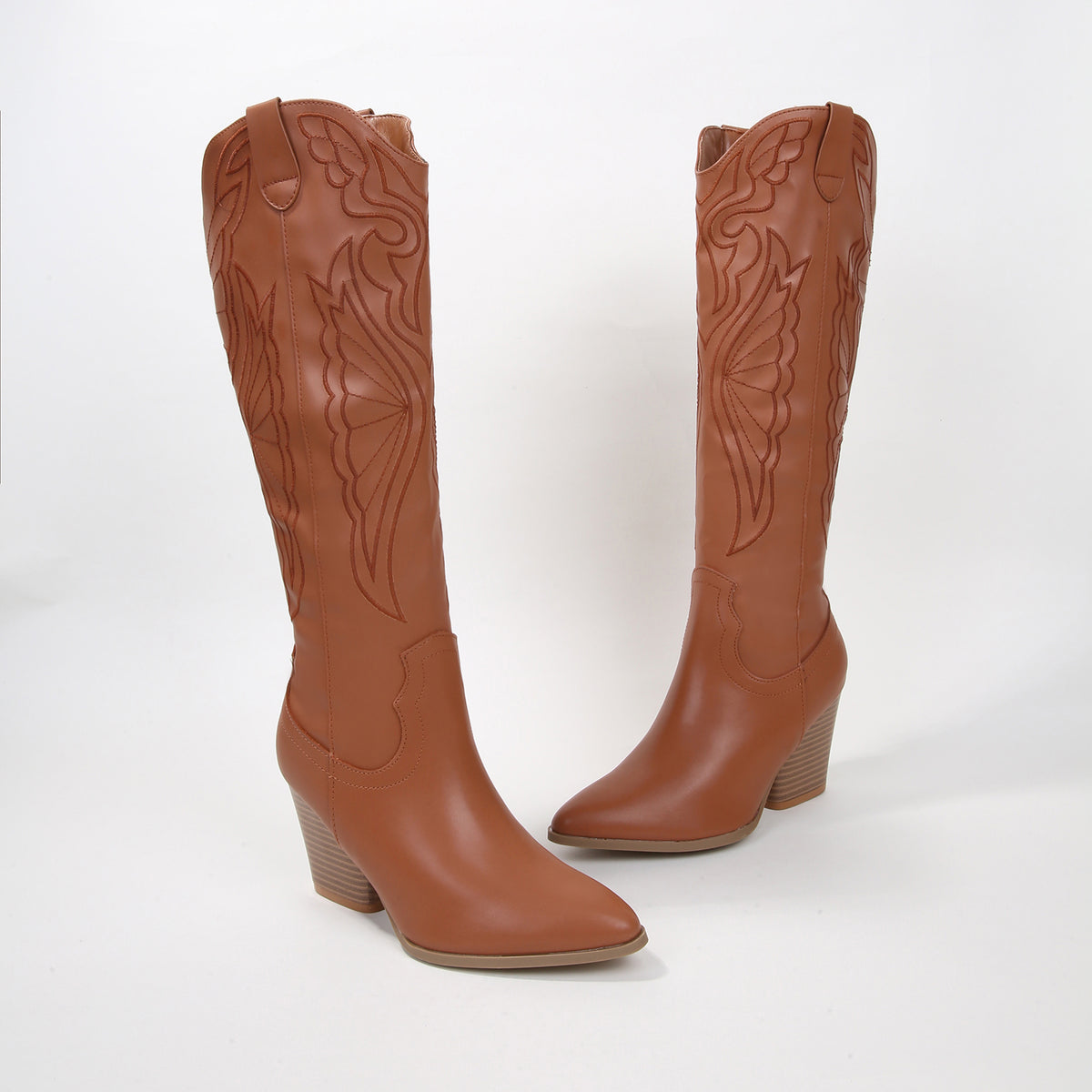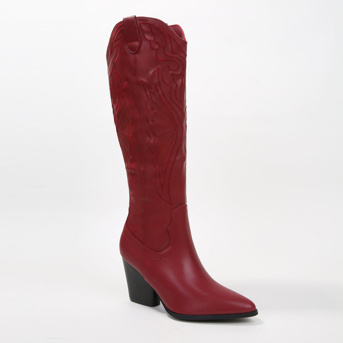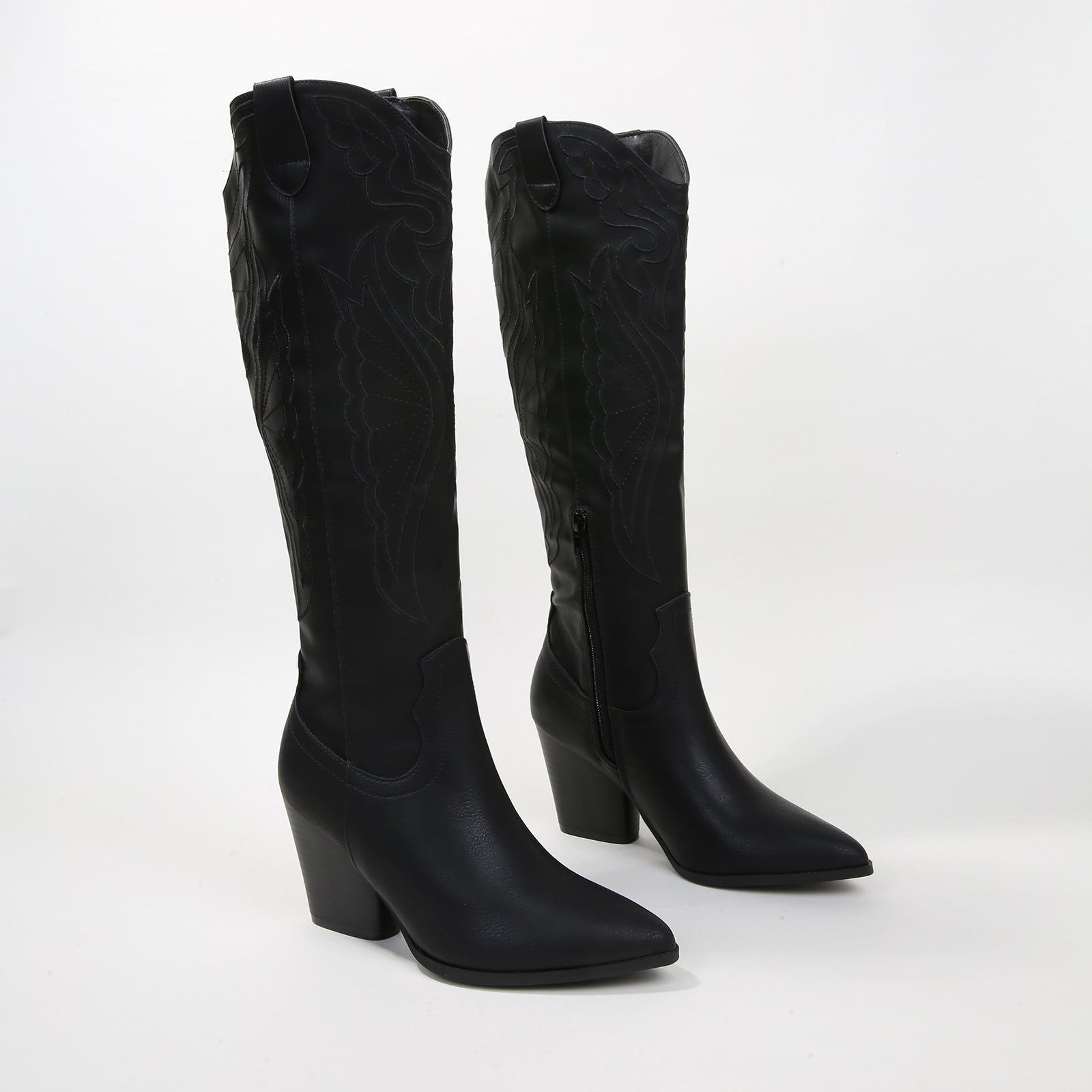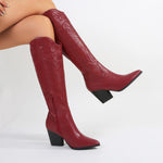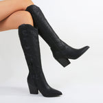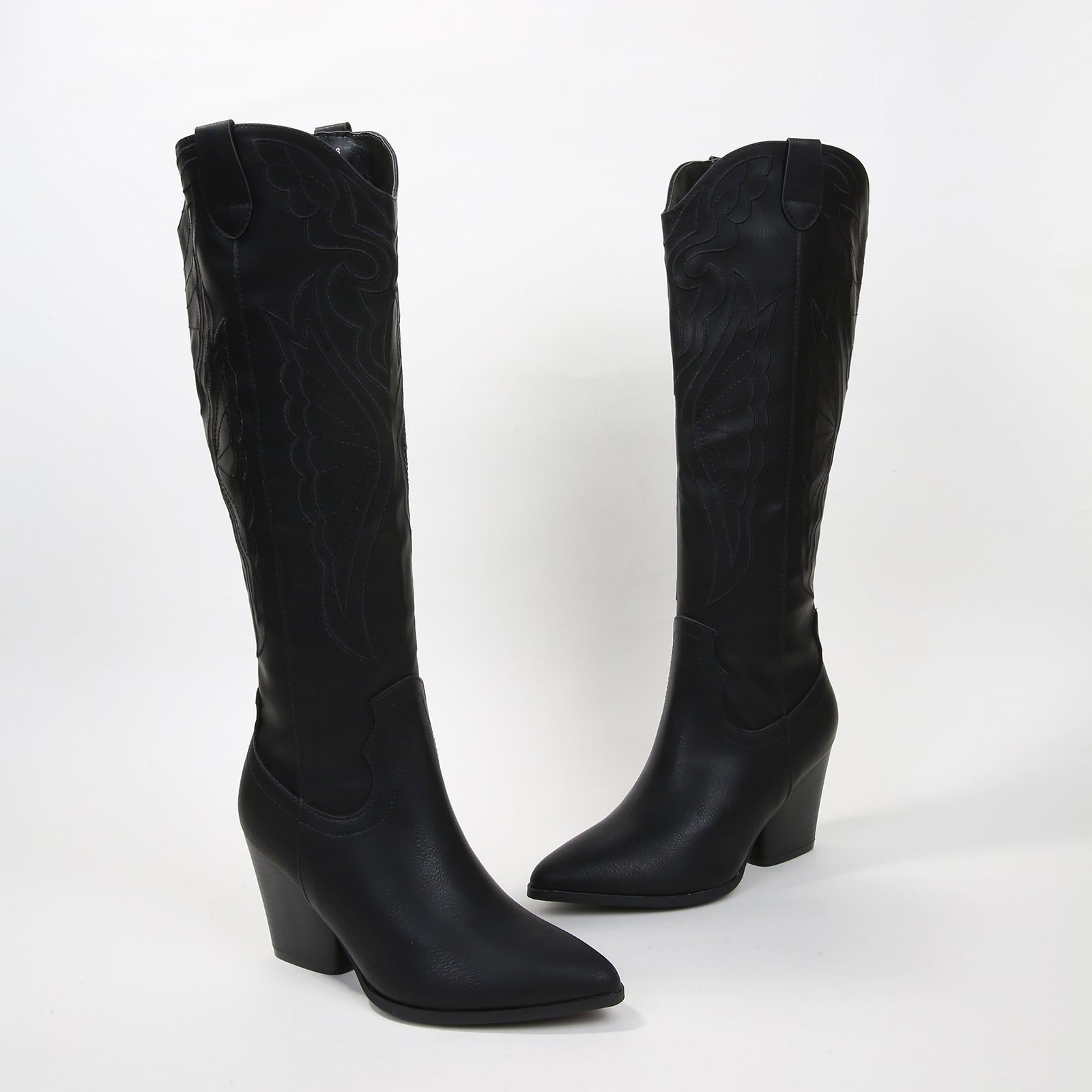 Bold yet timeless, these knee-high western boots capture statement style with their intricate embroidery and sleek silhouette. Featuring a pointed toe and stacked western block heel, they bring confident flair to every step. Perfect for adding a chic cowboy touch to your fall and winter looks.