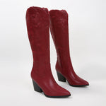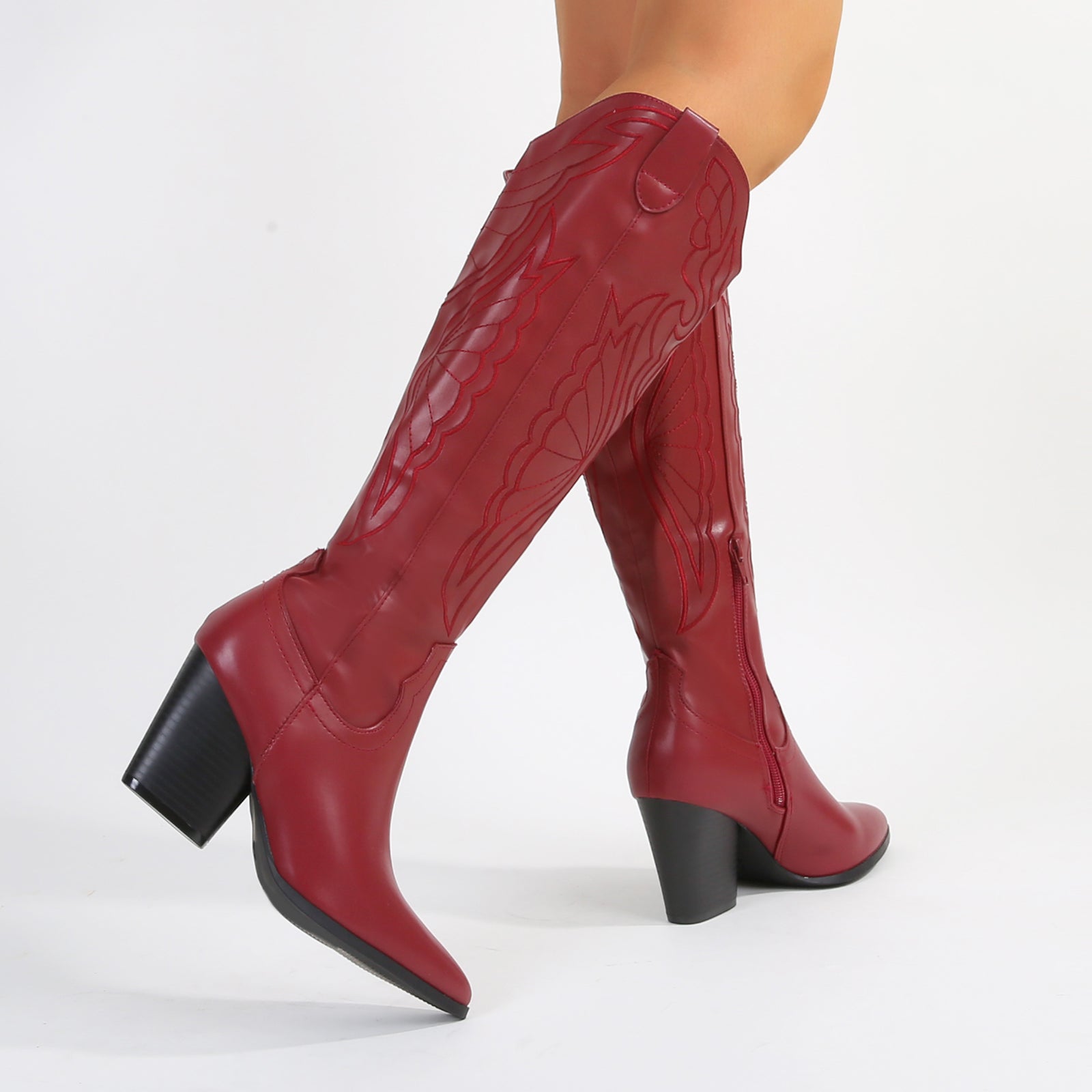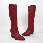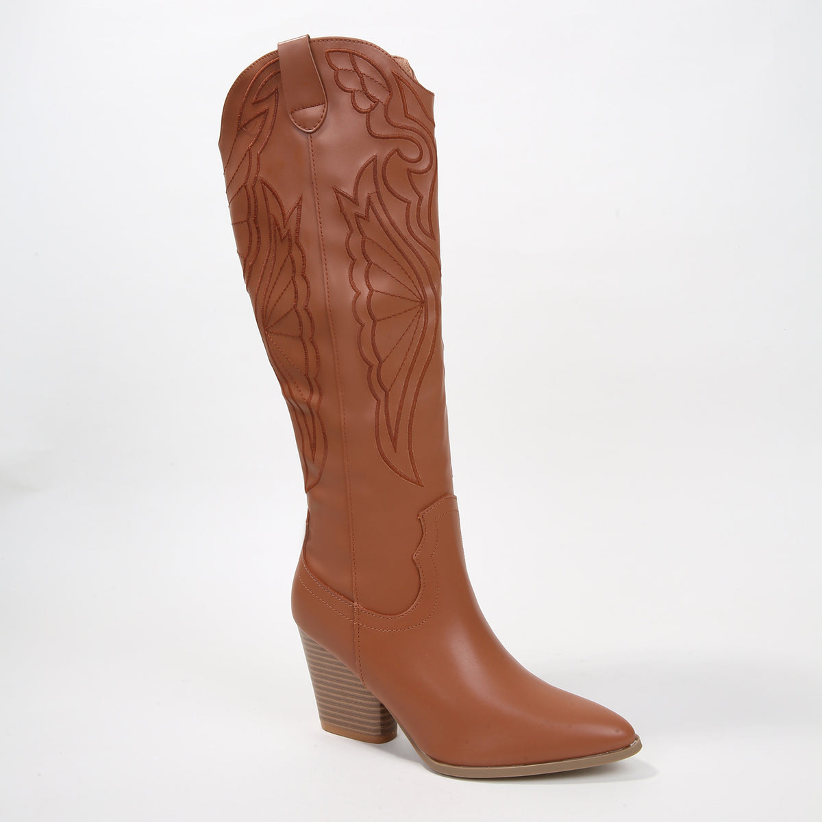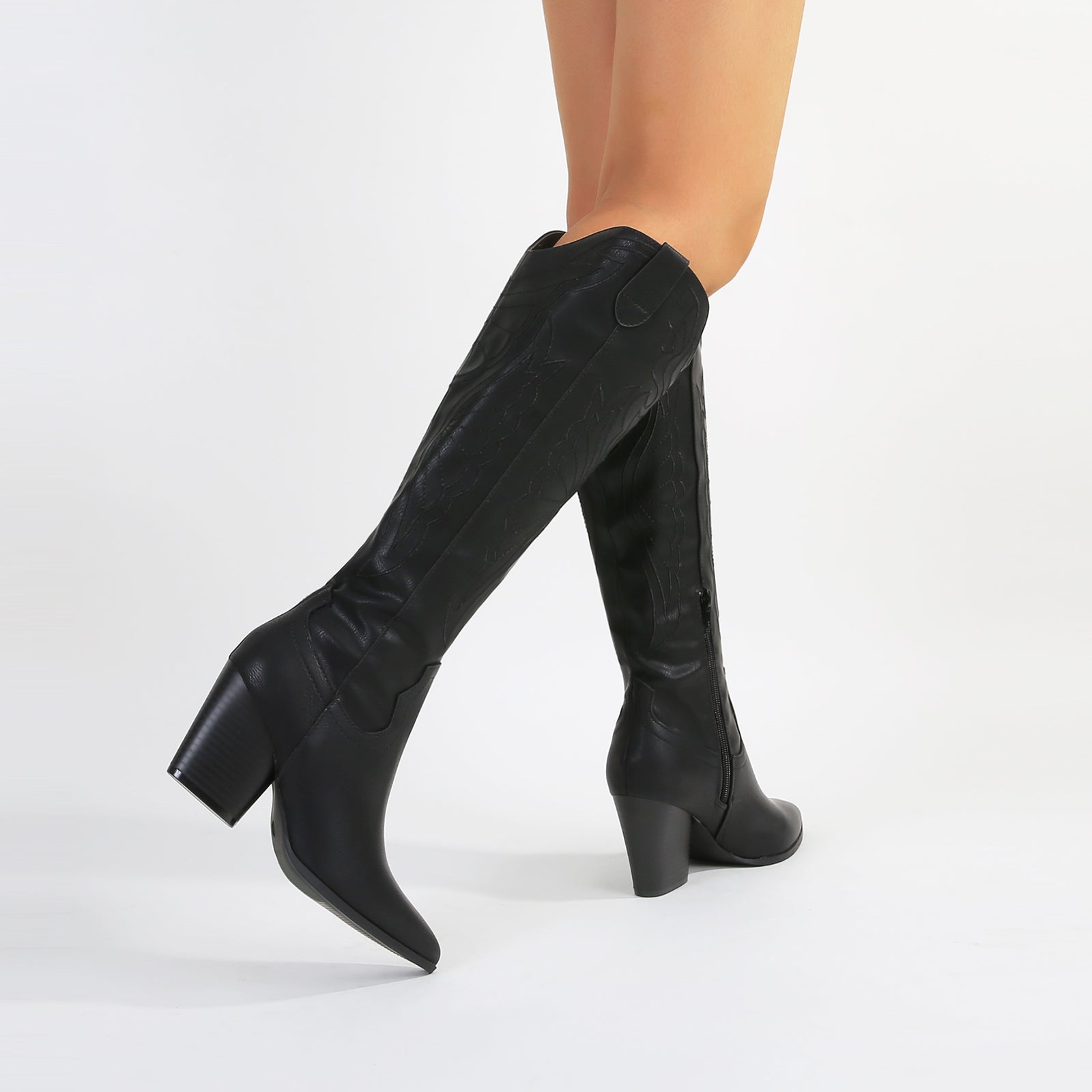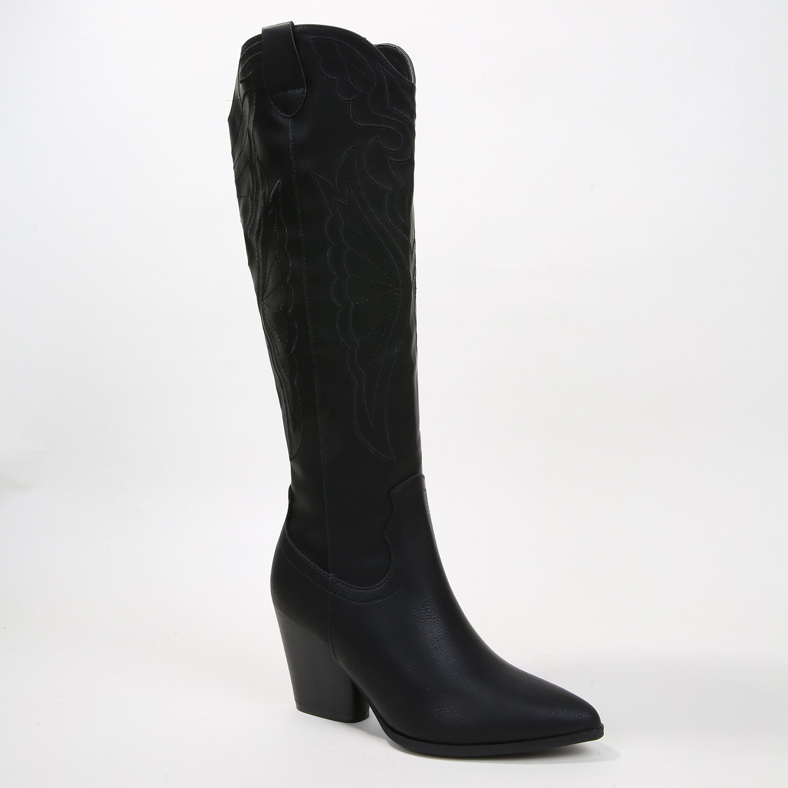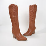 Bold yet timeless, these knee-high western boots capture statement style with their intricate embroidery and sleek silhouette. Featuring a pointed toe and stacked western block heel, they bring confident flair to every step. Perfect for adding a chic cowboy touch to your fall and winter looks.