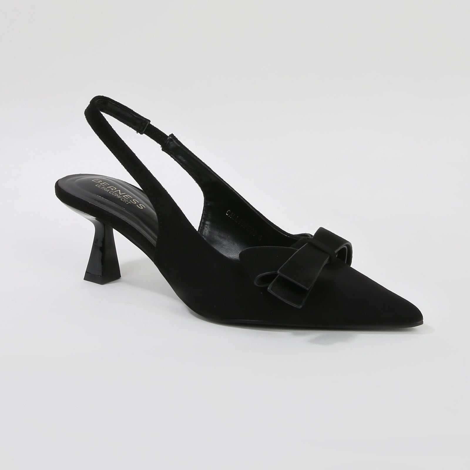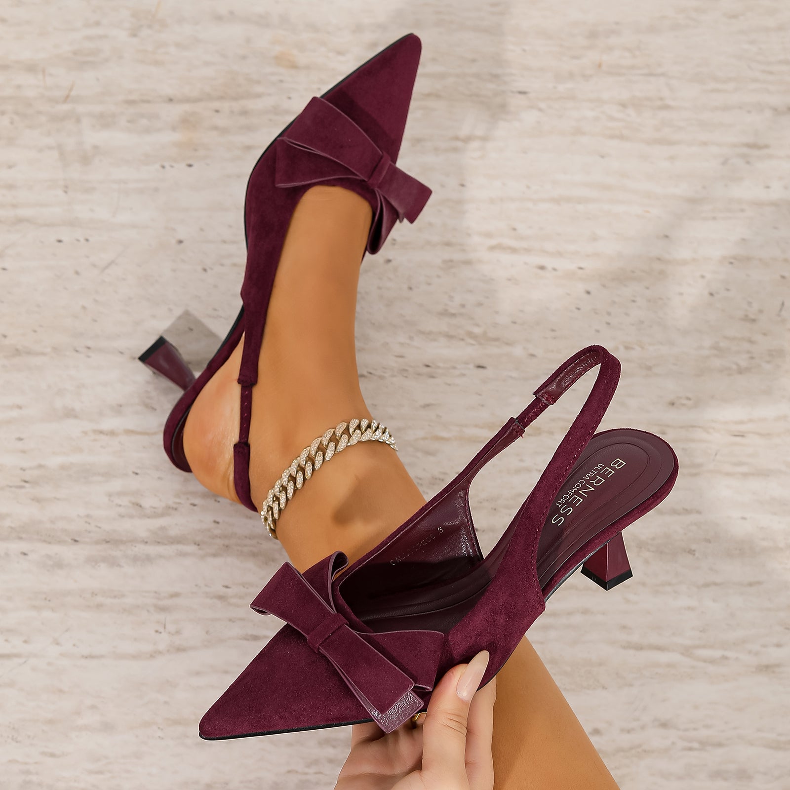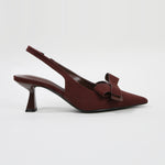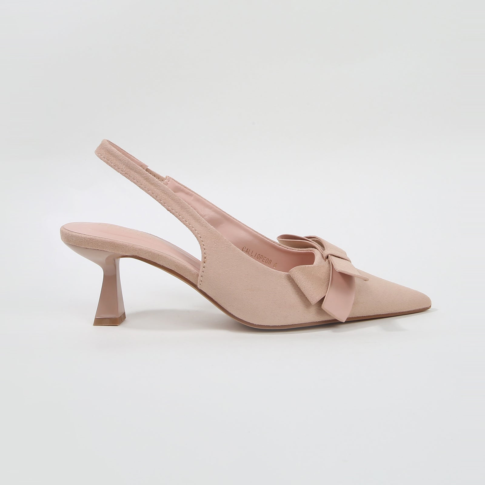 Soft, elegant, and effortlessly polished. Calliope heels features a refined faux suede upper with a delicate bow detail and a sleek pointed toe silhouette. Designed with a comfortable kitten heel and slingback strap, this style transitions seamlessly from office days to date nights, weddings, and semi-formal events where understated elegance makes the statement.