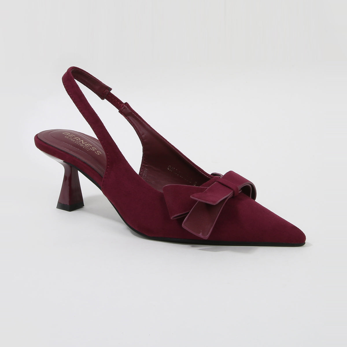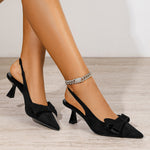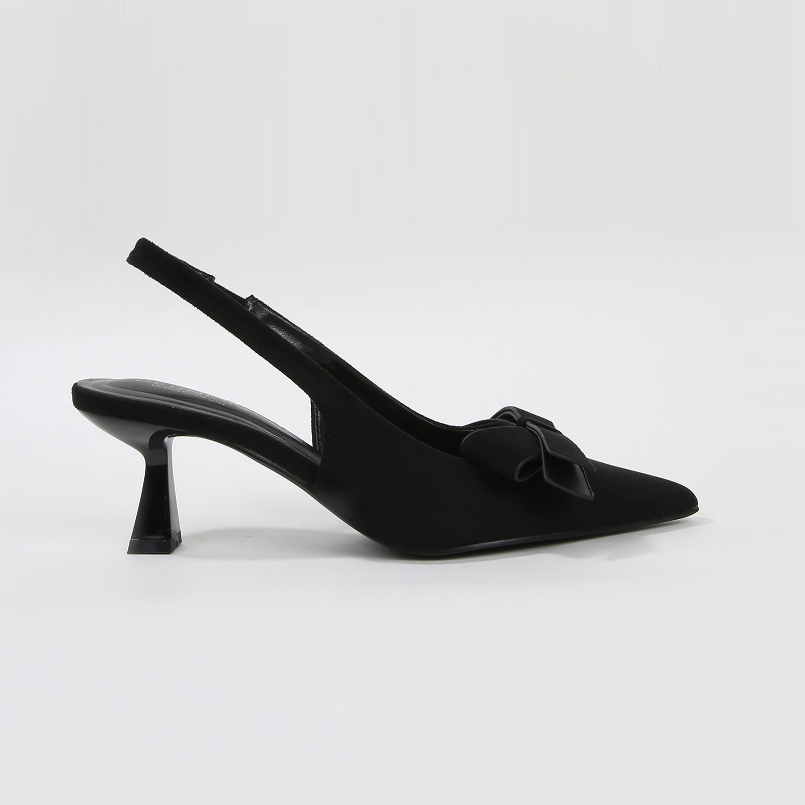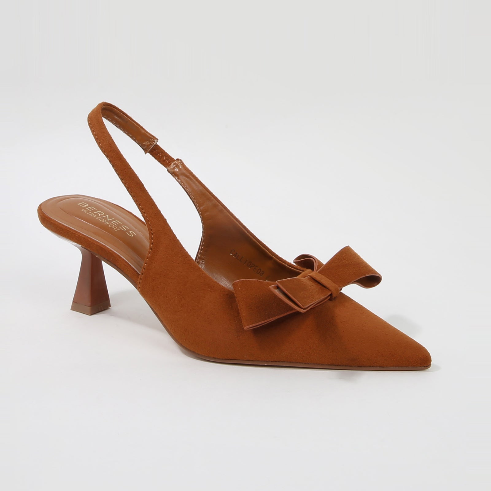 Soft, elegant, and effortlessly polished. Calliope heels features a refined faux suede upper with a delicate bow detail and a sleek pointed toe silhouette. Designed with a comfortable kitten heel and slingback strap, this style transitions seamlessly from office days to date nights, weddings, and semi-formal events where understated elegance makes the statement.