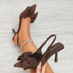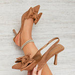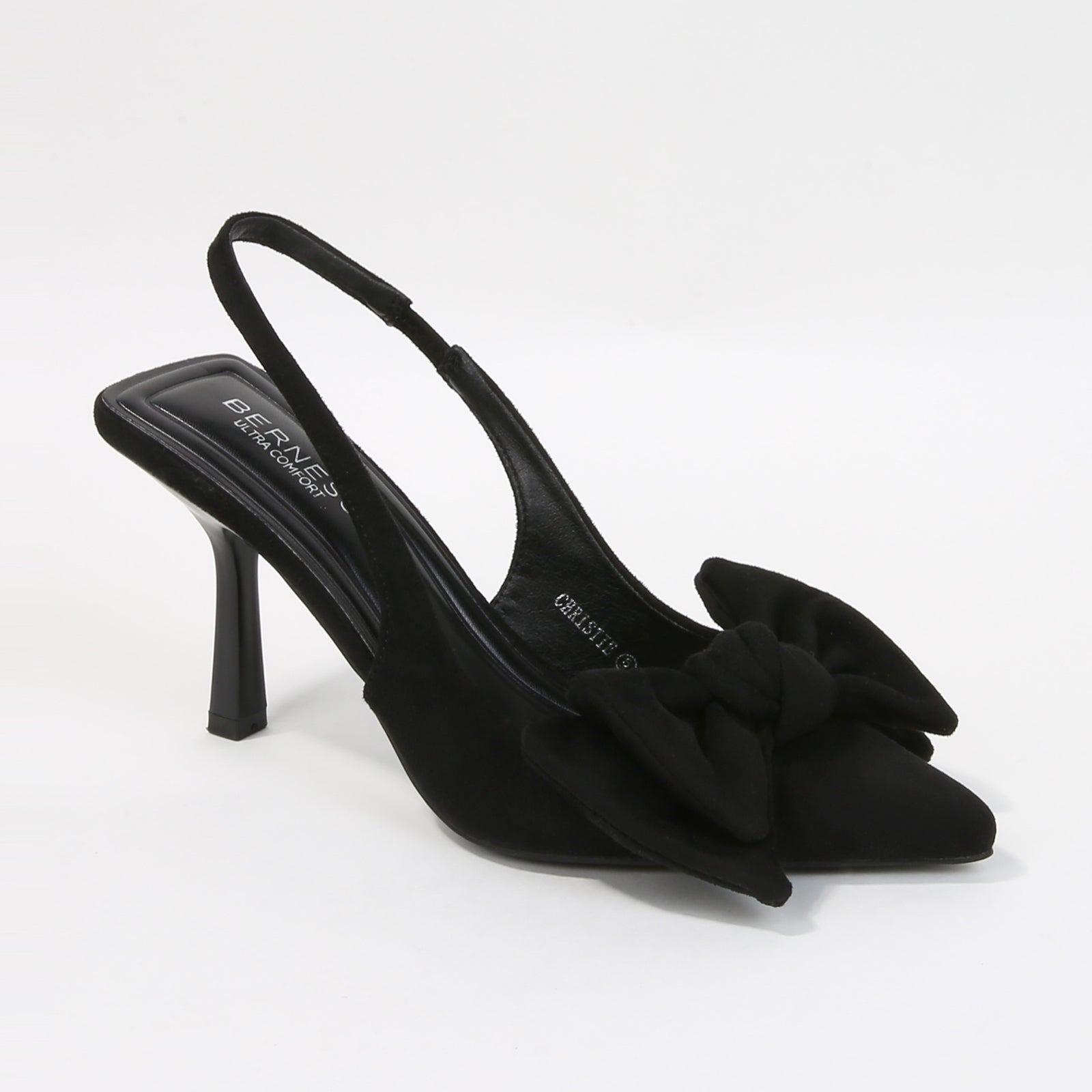 Feminine and refined slingback pumps crafted in soft suede with a bold bow accent. Featuring a pointed toe and slender high heel, they add a romantic yet sophisticated touch to both day and evening looks.