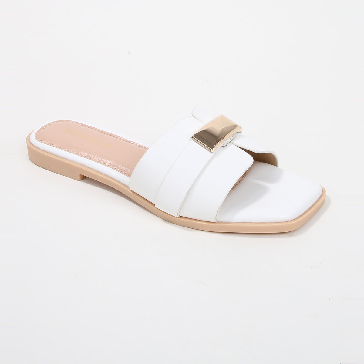 Sleek and modern slide sandals crafted in smooth vegan leather, detailed with a polished metallic buckle. Their minimalist silhouette and comfortable flat sole make them the perfect versatile choice for casual days, weekend getaways, or chic summer evenings.